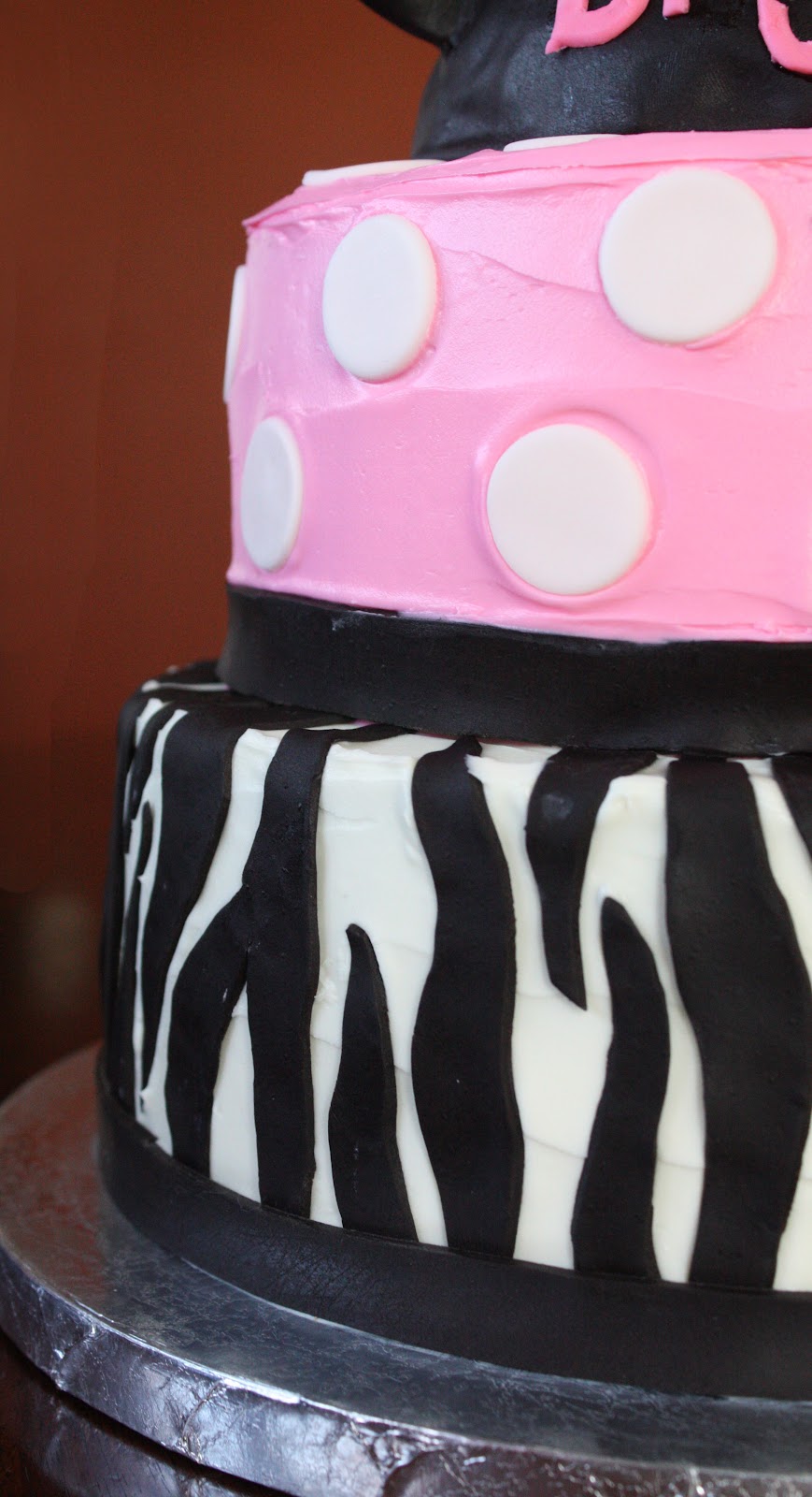 For this cake I was asked to create a mix of Minnie Mouse and Zebra print. It initially seemed like a difficult task, but turned out quite nice. This is a 2 tier cake with a rice cereal treat Minnie Mouse hat. I also made a "smash" cake for the birthday girl that was the same design as the top tier.